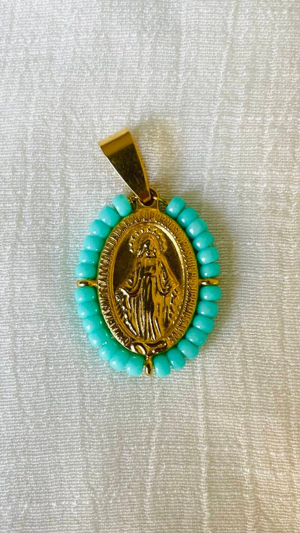 Médaille miraculeuse en acier inoxydable ornée de perles de rocailles. Fait main en France