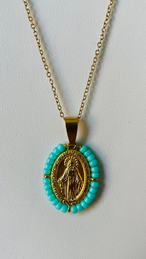Médaille miraculeuse en acier inoxydable, ornée de perles de rocaille et montée sur une chaîne en acier inoxydable.